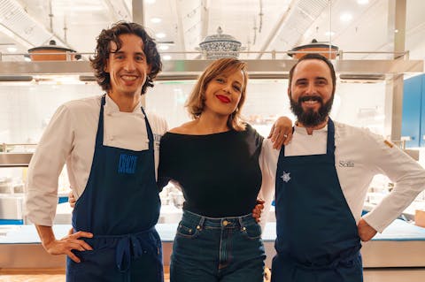 In 2023, her partner Stefano Bacchelli opened Scilla, a Mediterranean restaurant housed in a 1930s villa. The atmosphere is that of warm, welcoming casual dining, underpinned by an almost obsessive attention to detail: from the Mediterranean-blue pass and cooking blocks by Marrone, to the colored glassware echoing the hues of ceramics with light-blue speckles, to the wooden staircase whose color reappears in the rim of the Franco Fasano plates.