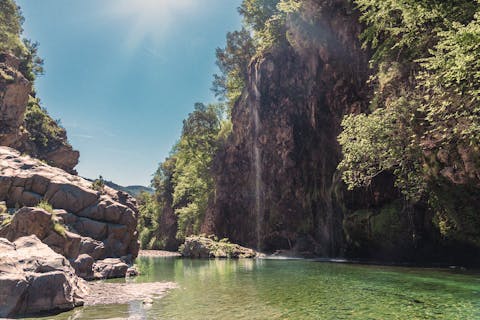 The Sa Stiddiosa waterfall is formed by a crystal-clear natural pool set between sheer rock walls that scatter a wonderful endless rain. Less than a one-hour drive from Olianas, this splendid waterfall stems from the waters of the upper karst spring, which plunge past the rocks smoothed by the incessant flow creating a thick drizzle. In Sardinian, Sa Stiddiosa means 'to drip', and here the constant dripping of the waterfall creates a crystal-clear emerald-green pool, where one can stop and admire this natural wonder up close. Sa Stiddiosa is a must-see for all nature lovers, especially those who wish to discover inland Sardinia’s distinctive unspoiled natural environment. Blessed with tropical-like features, it’s an earthly Eden where you can let go and immerse yourself in nature: there’s no cell service out here, so you can unwind and enjoy moments of relaxing silence, enhanced by the perennial falling of Sa Stiddiosa's gentle drops.