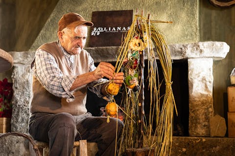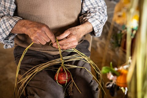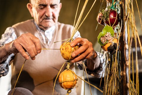 Sul tavolo ci sono i sessini: foglie lunghe e resistenti, messe a mollo nei giorni precedenti per renderle malleabili al lavoro ed evitare che si spezzino. Vinicio ne sceglie sei, le piega con un gesto sicuro e inizia l’intreccio, senza fretta, mentre ci racconta: “Ho imparato da mia nonna, avevo sei, forse sette anni.” Da lì tutto prende forma. Prima la struttura, poi il resto. Vinicio aggiunge i frutti uno alla volta: le arance, le melagrane, quello che la stagione offre. Ogni elemento trova il suo equilibrio. Su Sessineddu cresce tra le mani, diventa riconoscibile. Non nasce per essere guardato nella sua semplicità quanto bellezza, ma per essere portato: prima in processione, poi in chiesa per la benedizione, infine torna a casa.
