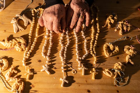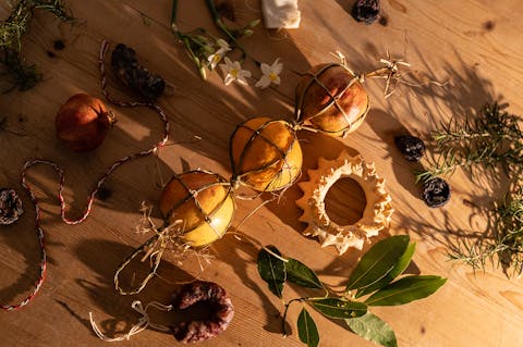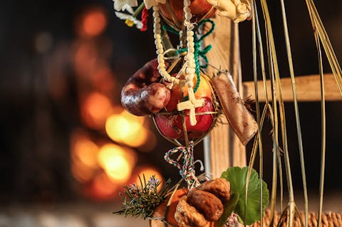 Sul tavolo ci sono i sessini: foglie lunghe e resistenti, messe a mollo nei giorni precedenti per renderle malleabili al lavoro ed evitare che si spezzino. Vinicio ne sceglie sei, le piega con un gesto sicuro e inizia l’intreccio, senza fretta, mentre ci racconta: “Ho imparato da mia nonna, avevo sei, forse sette anni.” Da lì tutto prende forma. Prima la struttura, poi il resto. Vinicio aggiunge i frutti uno alla volta: le arance, le melagrane, quello che la stagione offre. Ogni elemento trova il suo equilibrio. Su Sessineddu cresce tra le mani, diventa riconoscibile. Non nasce per essere guardato nella sua semplicità quanto bellezza, ma per essere portato: prima in processione, poi in chiesa per la benedizione, infine torna a casa.